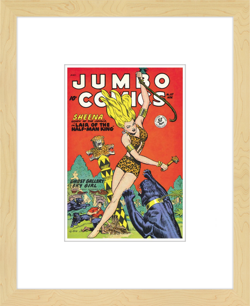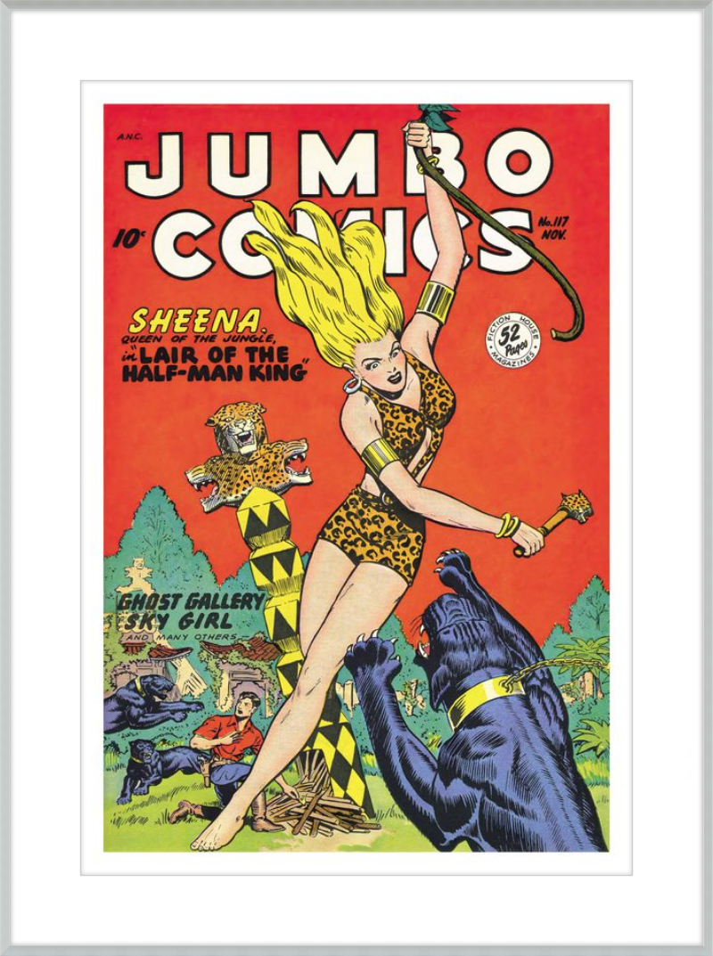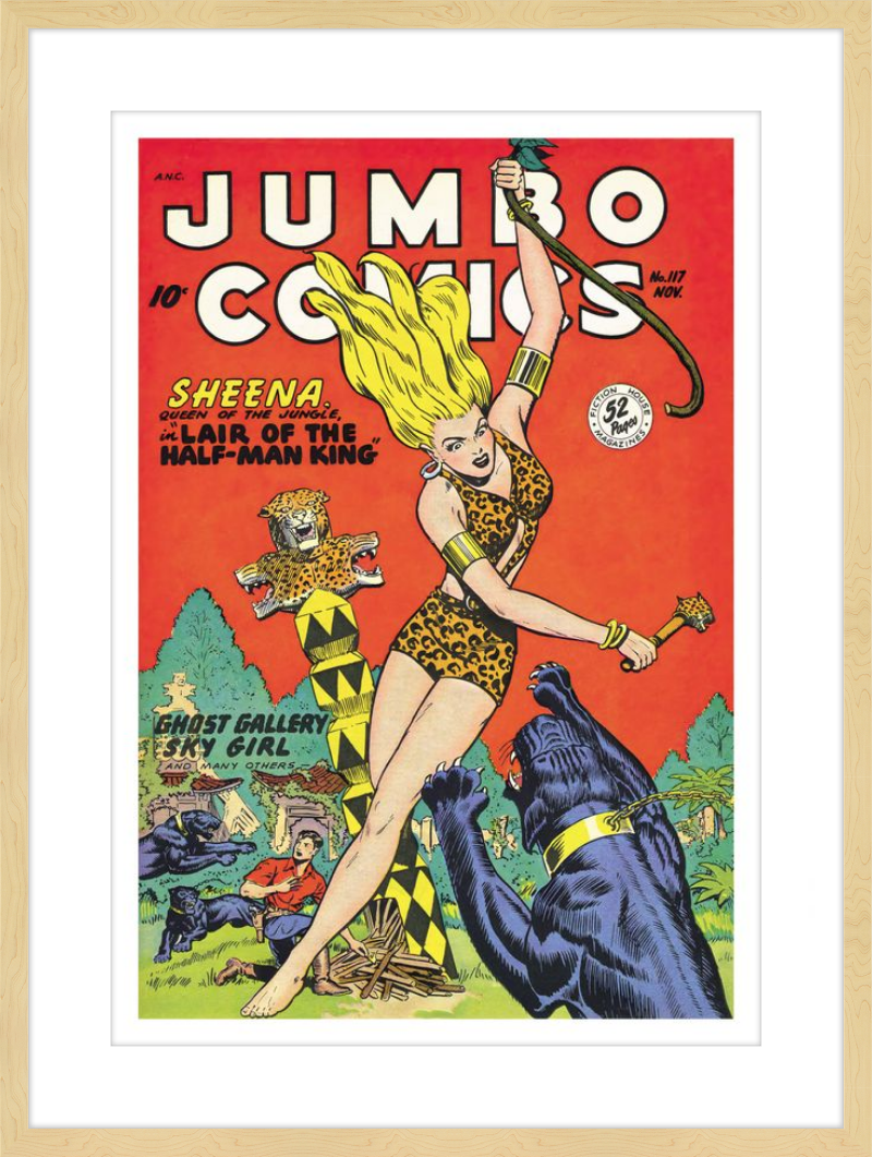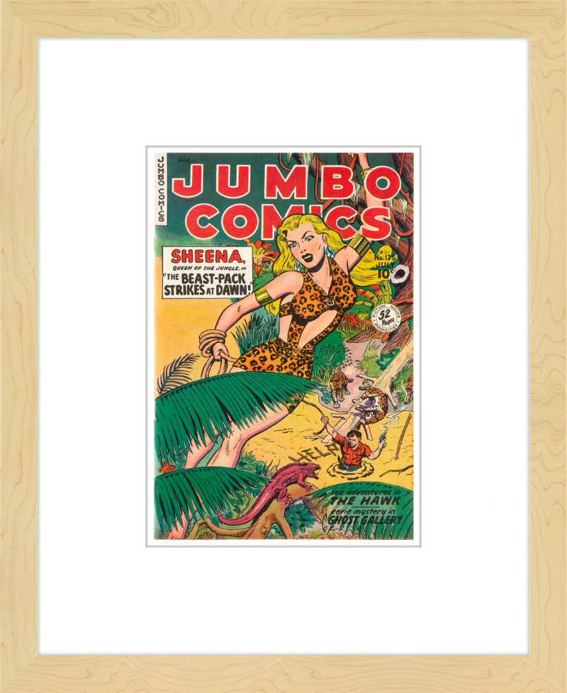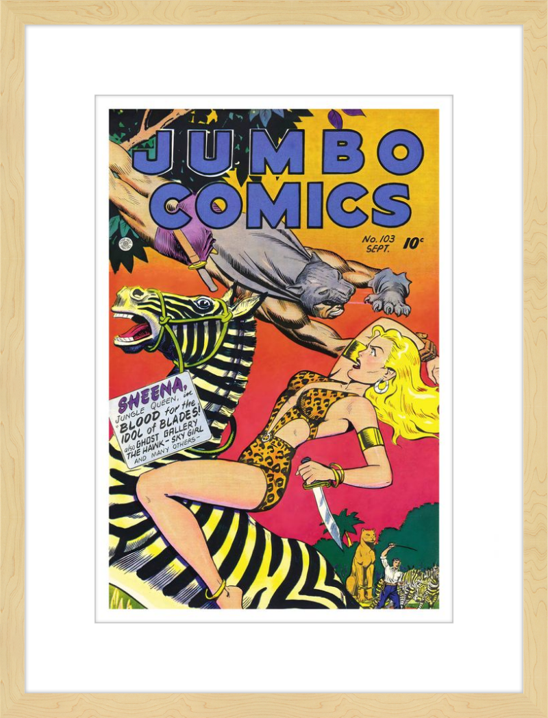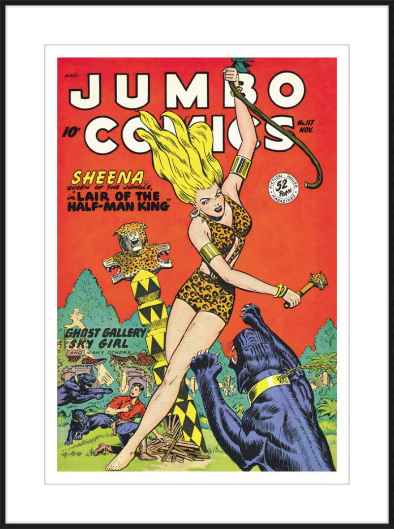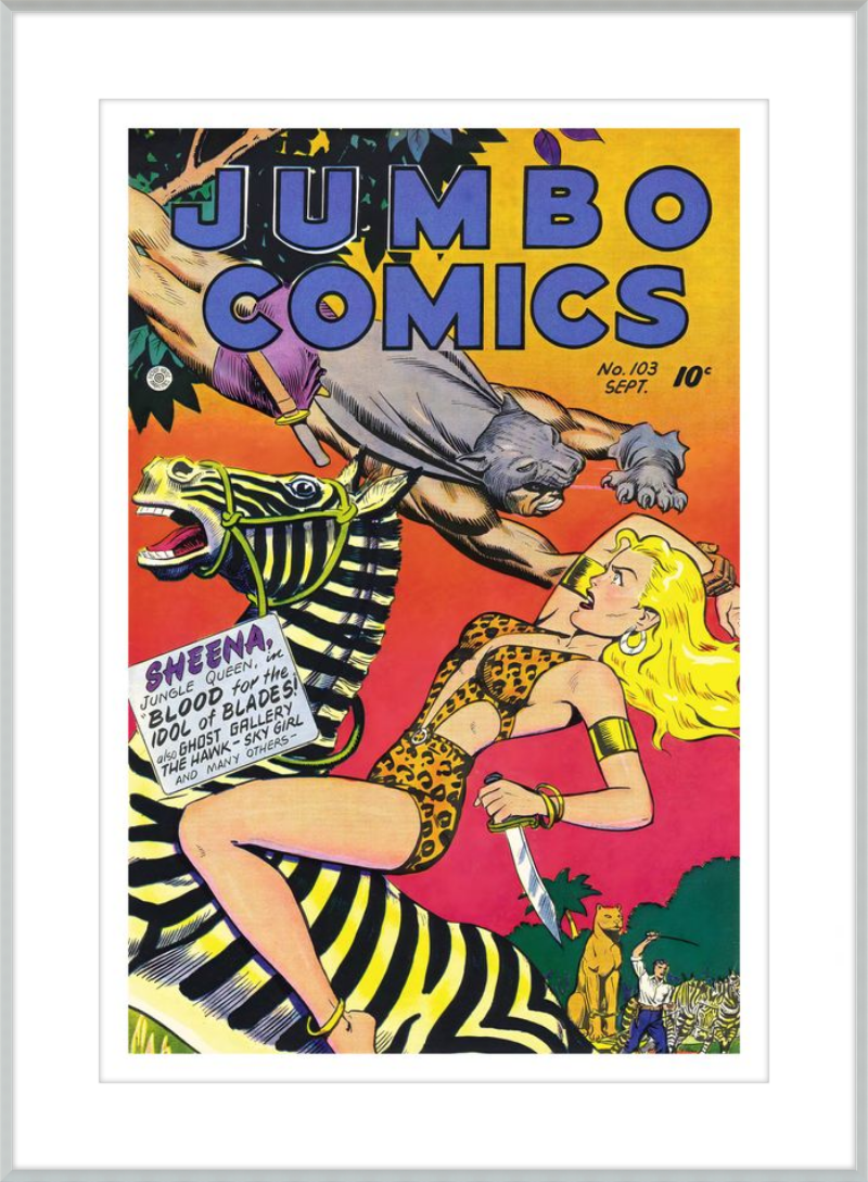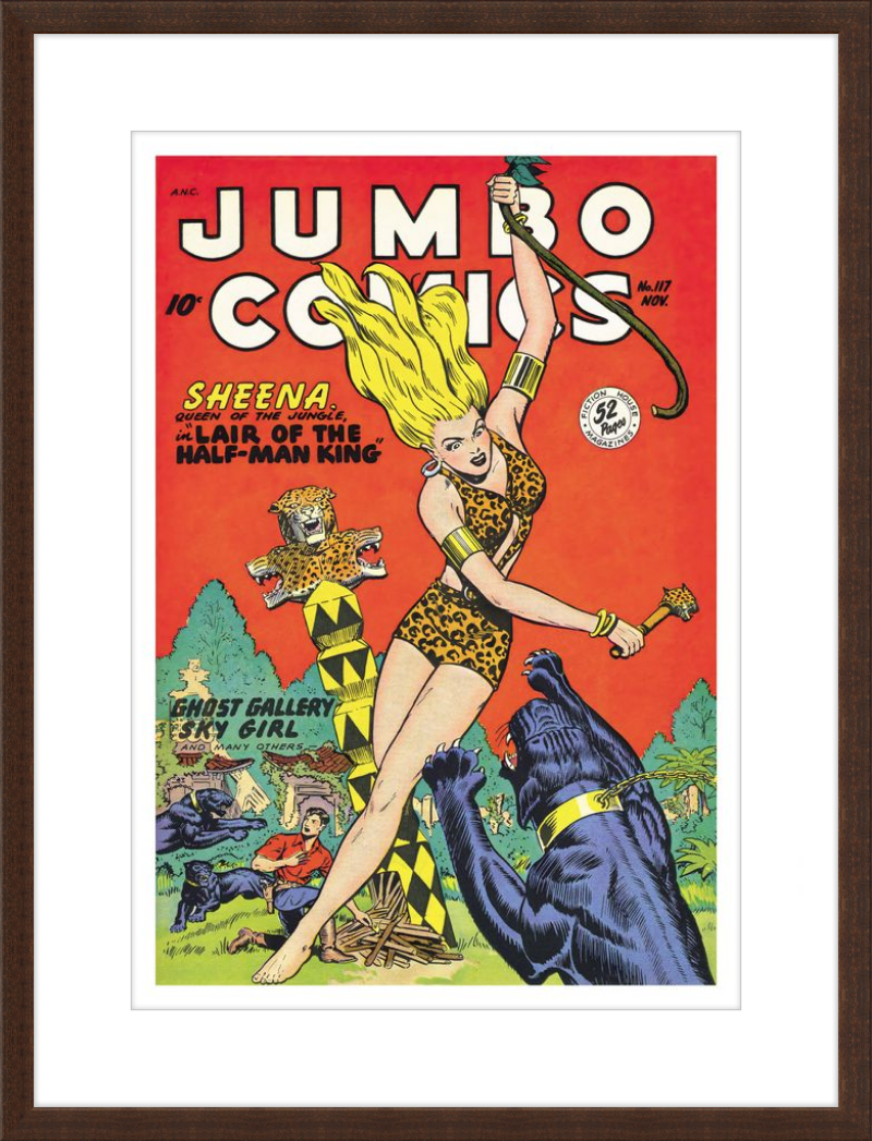 This August 1948 issue of Jumbo Comics showcases Sheena, Queen of the Jungle, in a dramatic encounter with a roaring lion, exemplifying the Golden Age's fascination with adventure and exoticism. Illustrated by Matt Baker, a pioneering African American artist celebrated for his dynamic compositions and expressive linework, the cover captures Sheena’s cultural significance as one of the earliest female action heroes in comics.