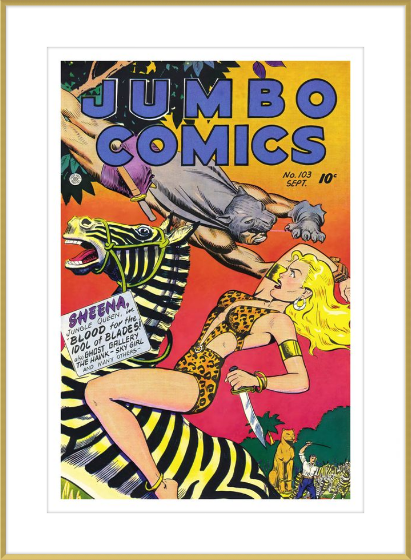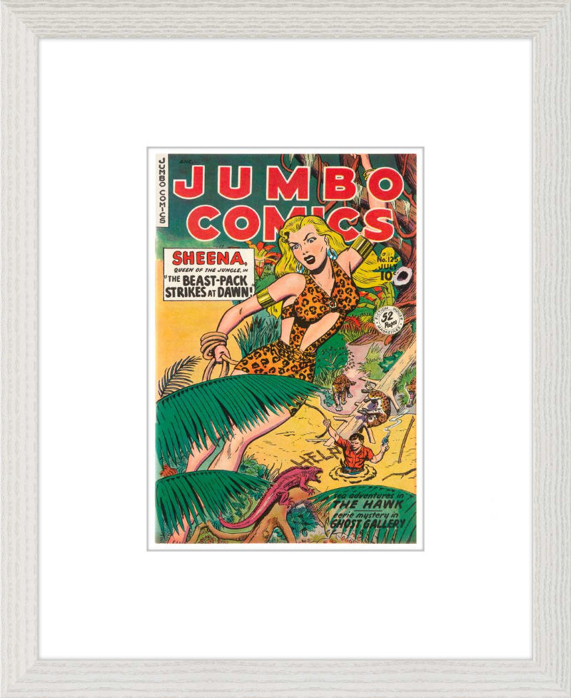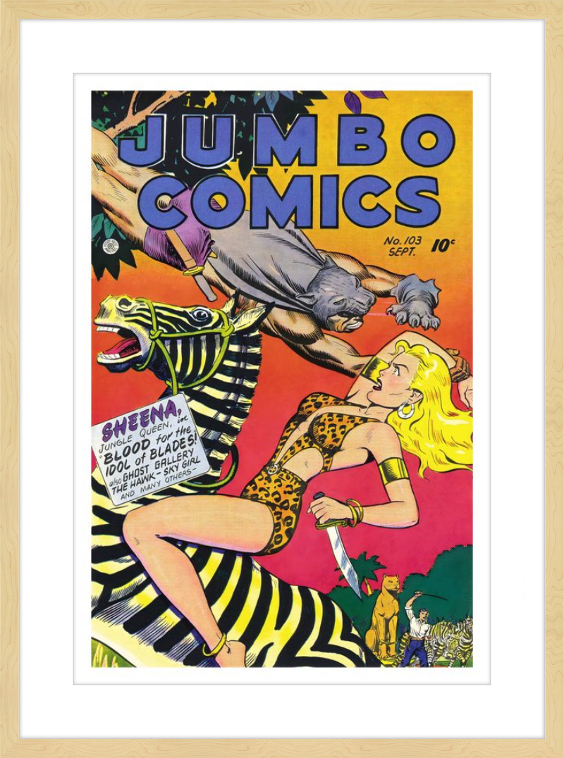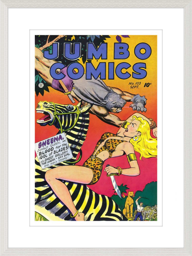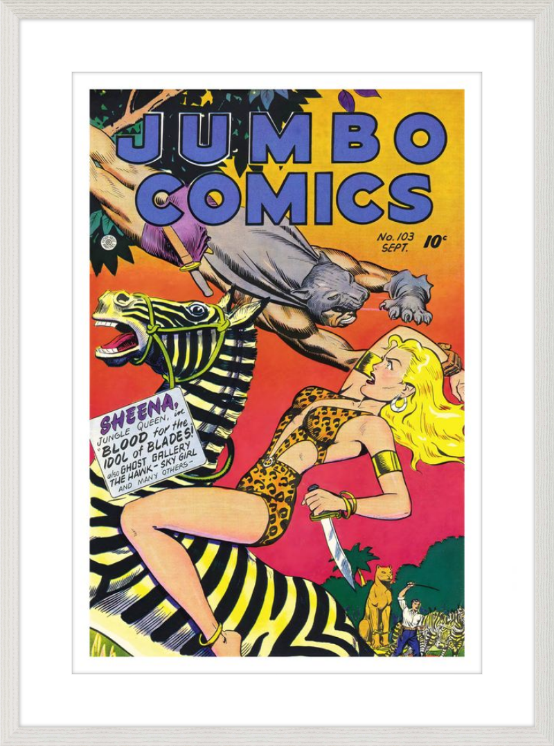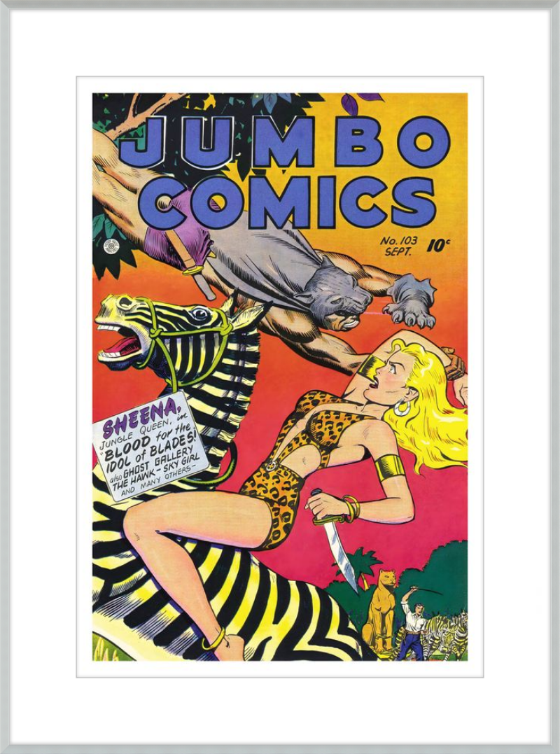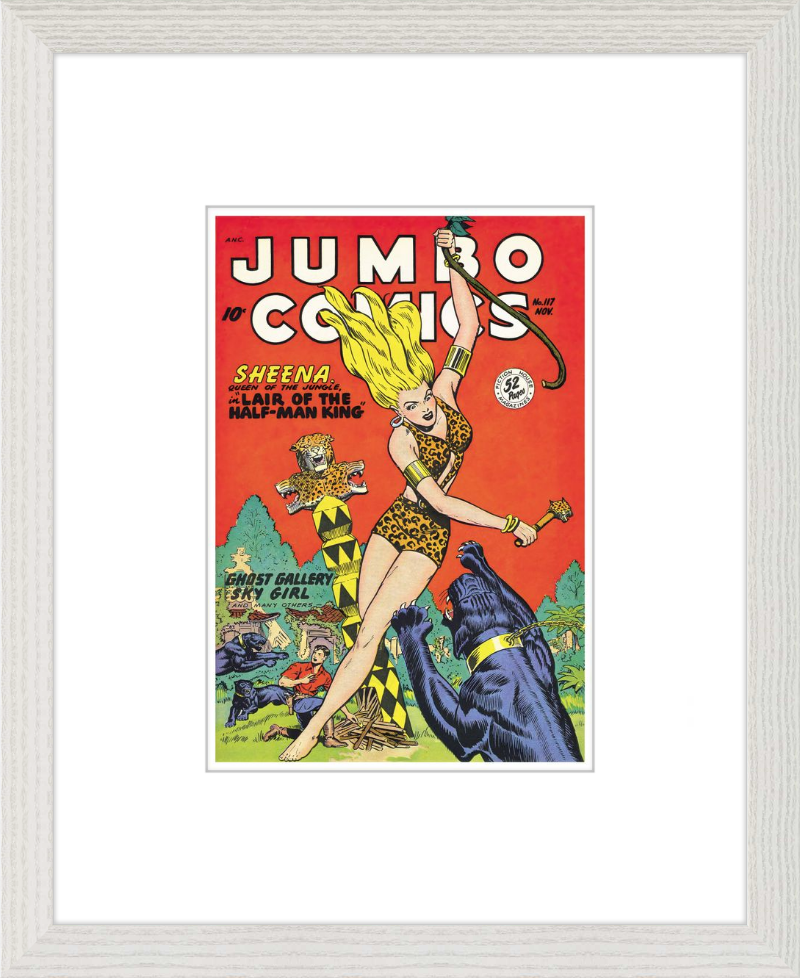This August 1948 issue of Jumbo Comics showcases Sheena, Queen of the Jungle, in a dramatic encounter with a roaring lion, exemplifying the Golden Age's fascination with adventure and exoticism. Illustrated by Matt Baker, a pioneering African American artist celebrated for his dynamic compositions and expressive linework, the cover captures Sheena’s cultural significance as one of the earliest female action heroes in comics.